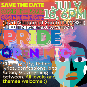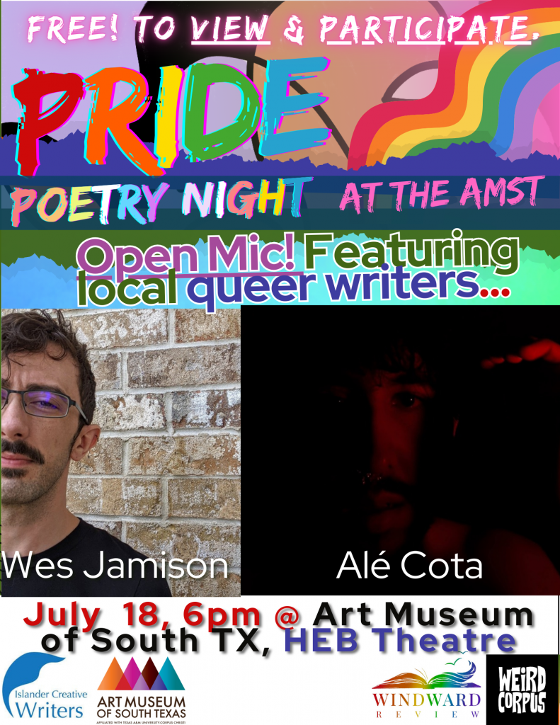 The Windward Review editors and Islander Creative Writers will partner with the Coastal Bend Wellness Pride Center and Pride Corpus Christi and the Art Museum of South Texas to bring you two fantastic keynote features and an Open Mic to celebrate Pride. All voices are invited to celebrate our queer beauty, history, creativity, healing, and collective wisdom.