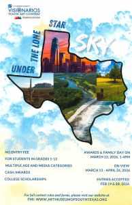 For the past 25 years, the Visionarios exhibition has celebrated the youthful perception and creativity contained by students of the coastal bend. This year’s theme is based on Under the Lone Star Sky.