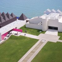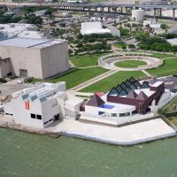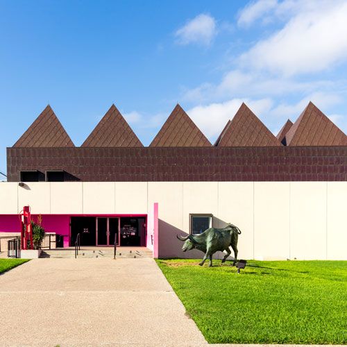 Nowhere is our blend of cultures more present than in the architecture of the museum itself. Originally designed by American architect, Philip Johnson in 1972, the Art Museum of South Texas has stood as a landmark on the edge of Corpus Christi Bay. The three-level facility was constructed of poured white concrete and shell aggregate creating a natural relationship with the environment. The windows give way to sweeping views of the bay making them works of art in their own right. In 2006, an expansion lead by Mexican architect, Ricardo Legorreta doubled the size of the space features 13 roof-top pyramids as well as stunning use of color and light.