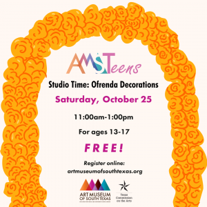 Come make decorations for an ofrenda with the AMSTeens. We will create paper flowers and other items to go on an ofrenda to be displayed at the Garcia Arts and Education Center.