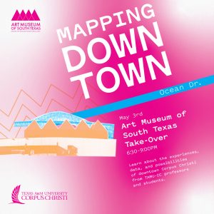On Tuesday, May 3rd from 6:30-9:00 PM the Art Museum of South Texas will be taken over by 100+ TAMU-CC students and professors presenting projects that relate to the experiences, data, and possibilities of Downtown Corpus Christi. This free event will be a great opportunity to engage with young people researching and analyzing our city and interact with other downtown stakeholders.
