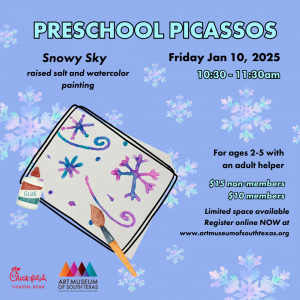 Let it snow! It’s not quite cold enough outside to snow in Corpus Christi, so we’ll make our own! Join us to read a winter story and create a snowy sky painting. We will learn how to use glue, salt and watercolors to make a colorful snow-filled sky.