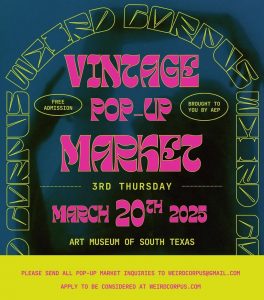 Third Thursday: Presented by AEP and organized by Weird Corpus. 3rd Thursdays are AMST’s FREE monthly community artisan parties! Each month visitors will have a different theme and idea to explore. While FREE admission lasts all day 10am-9pm, vendors and the evening’s events begin at 5:30pm.