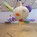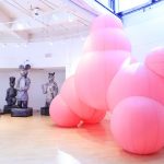 Featuring a new roster of artists, BLOW UP II includes work by Nicole Banowetz, Sharon Engelstein, FriendsWithYou, Josh Harker, Susan Lee-Chun, Matt Ritchie, Lizbeth Rossof, Jen Stark, and Max Streicher– many of whom have never worked in the inflatable medium previously. The resulting artworks reflect a variety of themes, including consumerism, pop culture, history, and even mortality. Many of the works convey a surreal sensibility through over-sized scale or an uncanny human connection, like Max Striecher’s sculptures that appear to be living, breathing beings. From the outset, the artworks in BLOW UP II appear fun and playful; however, there is a touch of melancholy throughout the show as we are reminded that these objects live their full lifecycle every day. Once the gallery lights dim, the artworks deflate and await their resurrection the following day. There is an odd relationship with these inflatable objects as they are just as dependent on air as we are.