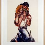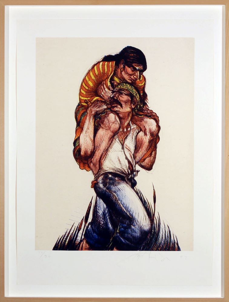 The impactful image of the small family presented in Luis Jimenez’s Border Crossing, 1987, is a totem-like image. The lithograph depicts a man carrying a woman who carries a small child in her arms. Ultimately Jimenez created a fiberglass sculpture which he dedicated to the memory of his grandfather who crossed the Mexico/U.S. border with Jimenez’s grandmother almost a century ago. The artist’s work tells stories reminding us that our history has many points of view, with many tales and ways to tell them.