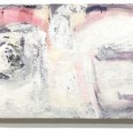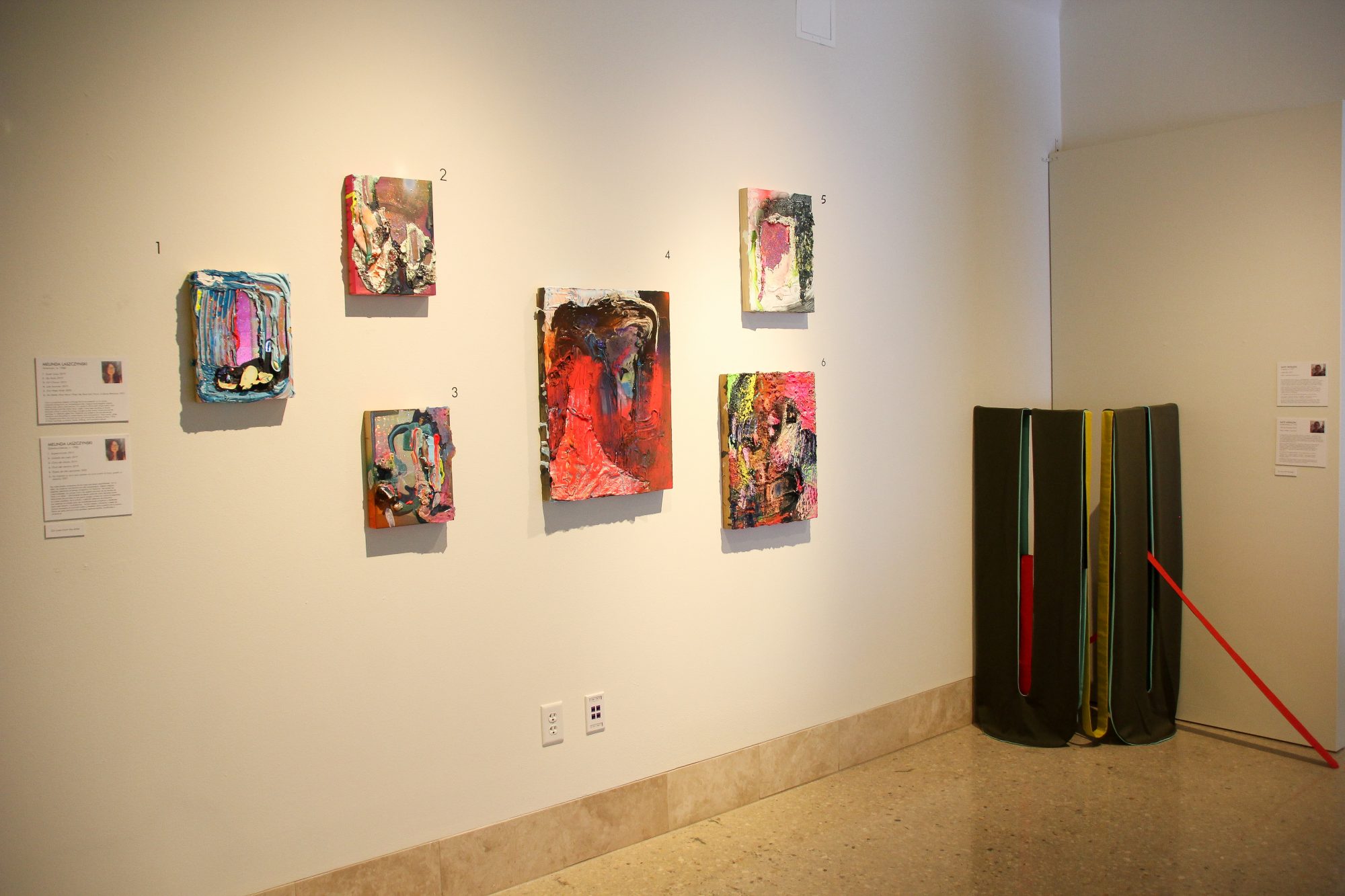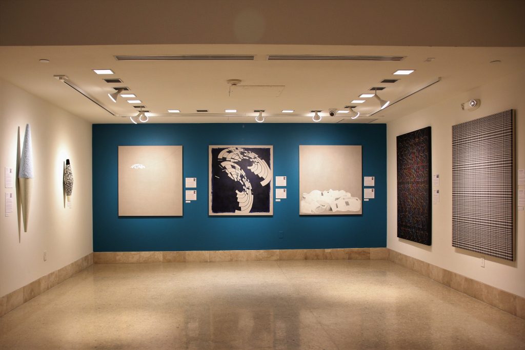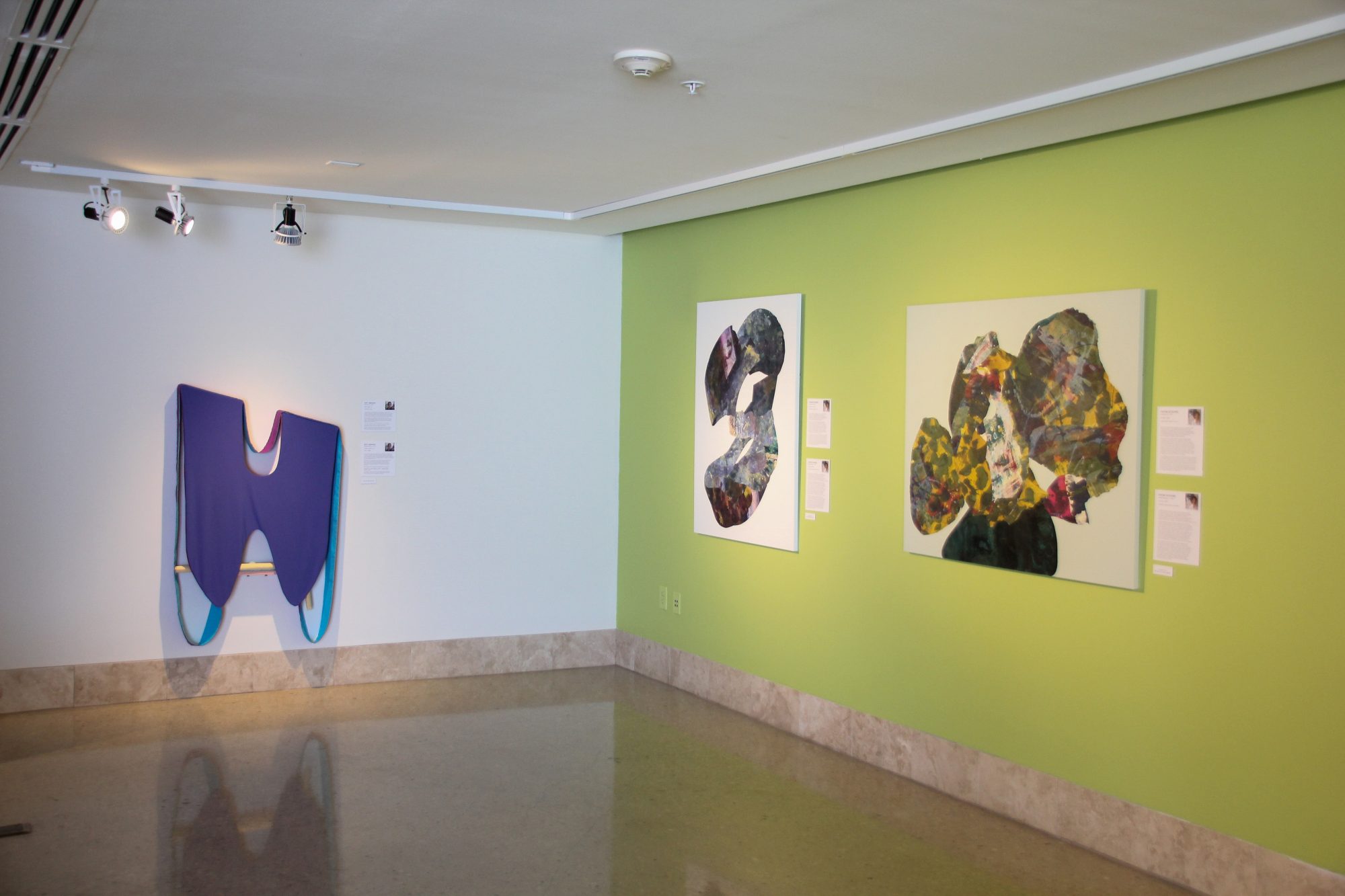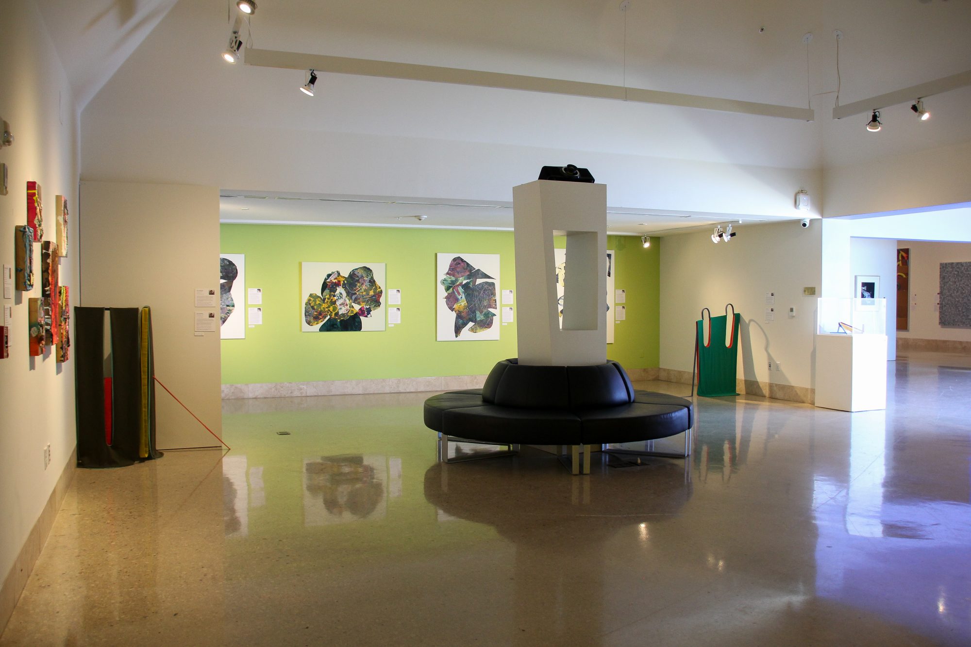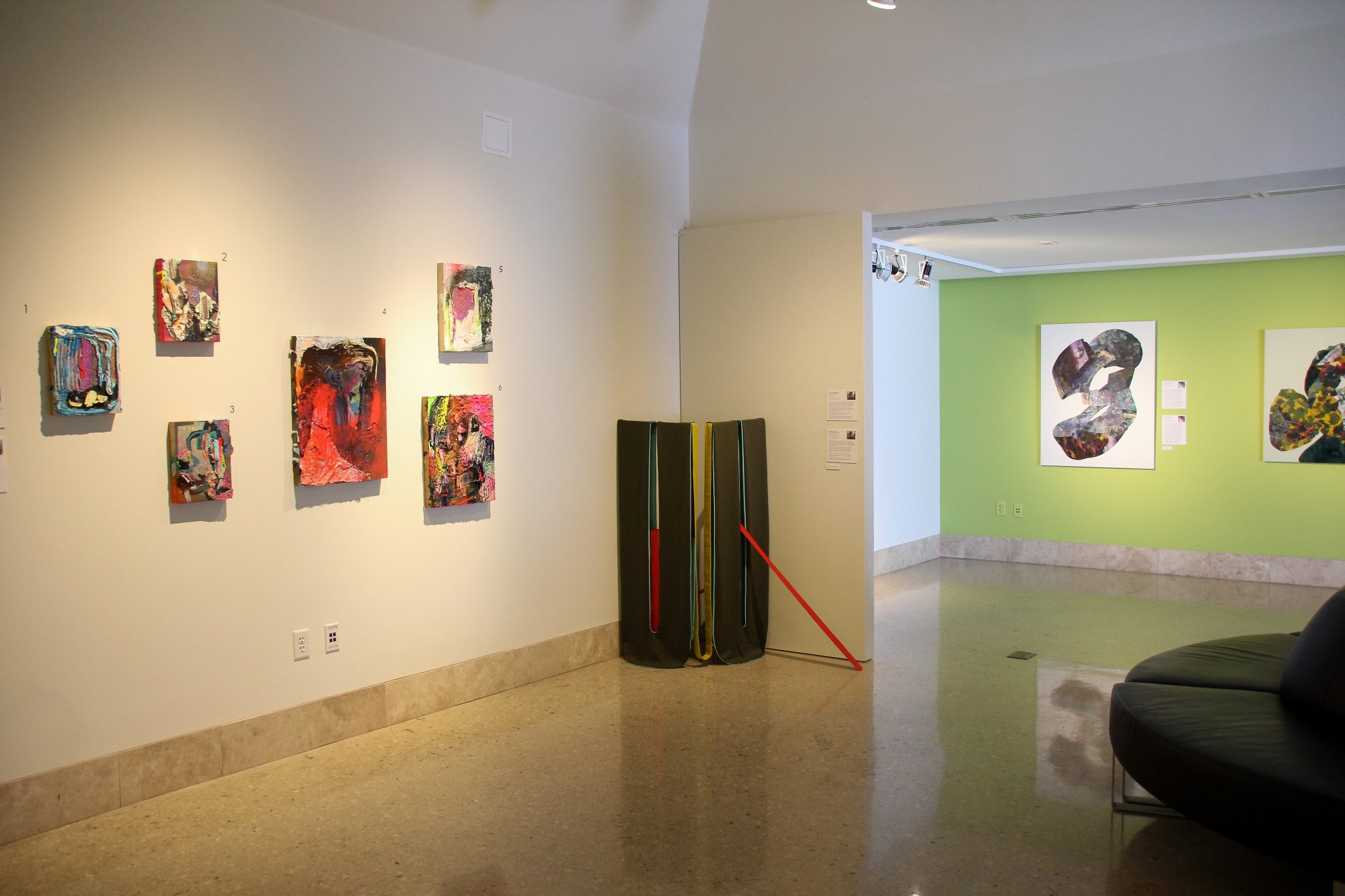 Contemporary sculptor Bethany Johnson (b. 1985) employs a mindful approach whose work is composed of found paper and wood materials which she compresses, taking on the appearance of a geological shift. Abstraction is a vast area that these artists mine in ways that give us many prompts to ponder. Making statements in abstract ways that are personal, such is the works of Dana Frankfort (b.1971), and experiential and conceptual artist Sara Cardona (b. 1971). Being playful as well as thought provoking with the material use and its impact features as a point of departure in the ubiquitous Slinky sculpted benches of Leticia Bajuyo (b. 1976). The soft sculptures by Katy Heinlein (b. 1972) rely on their stance constructed by their relationship to the wall, or floor, or pedestal in suspended color-formed-encounters. The paintings of Leila McConnell (b. 1927) deliver in their messaging a resonance of space in composition and atmosphere which conveys a quality not unlike spiritual meditation. The two large paintings by Susie Rosmarin (b. 1950) often come from an examination of everyday encounters. Her observations are delivered with precision that she devises by masking with tape her stages of paint to reveal a pattern of stunning optic accuracy once the tape is removed.