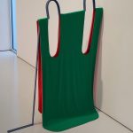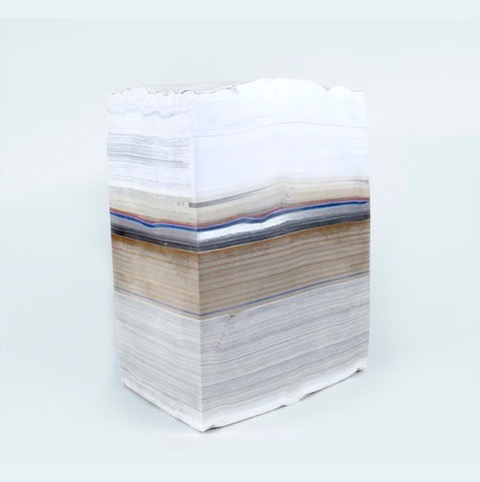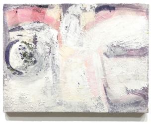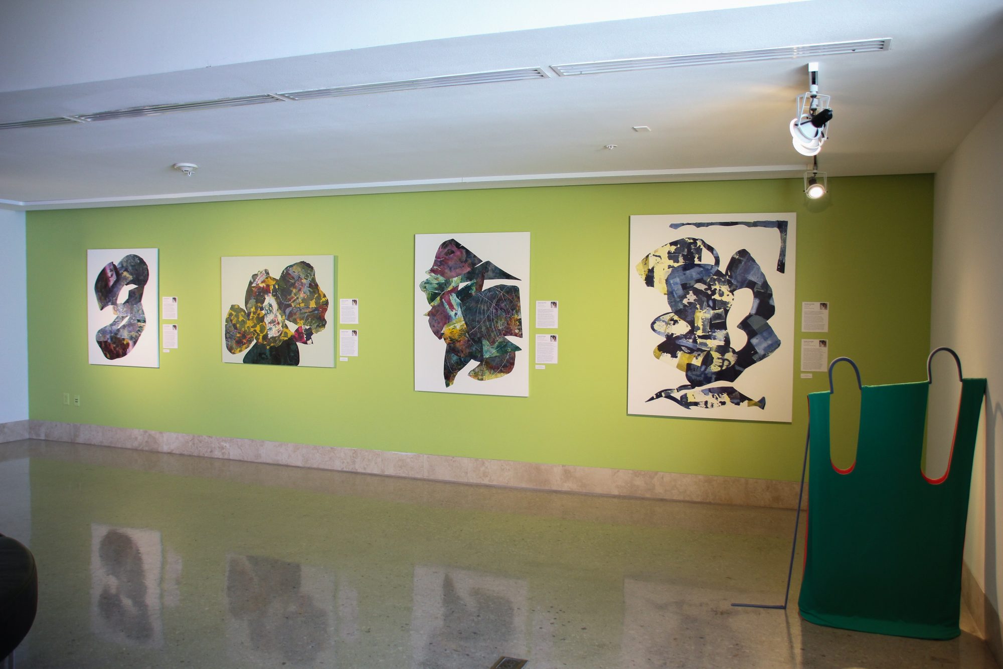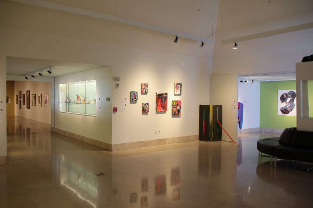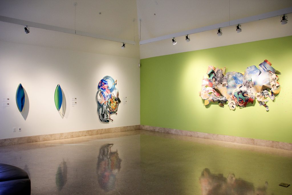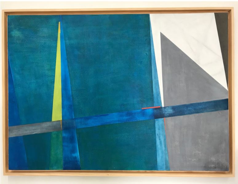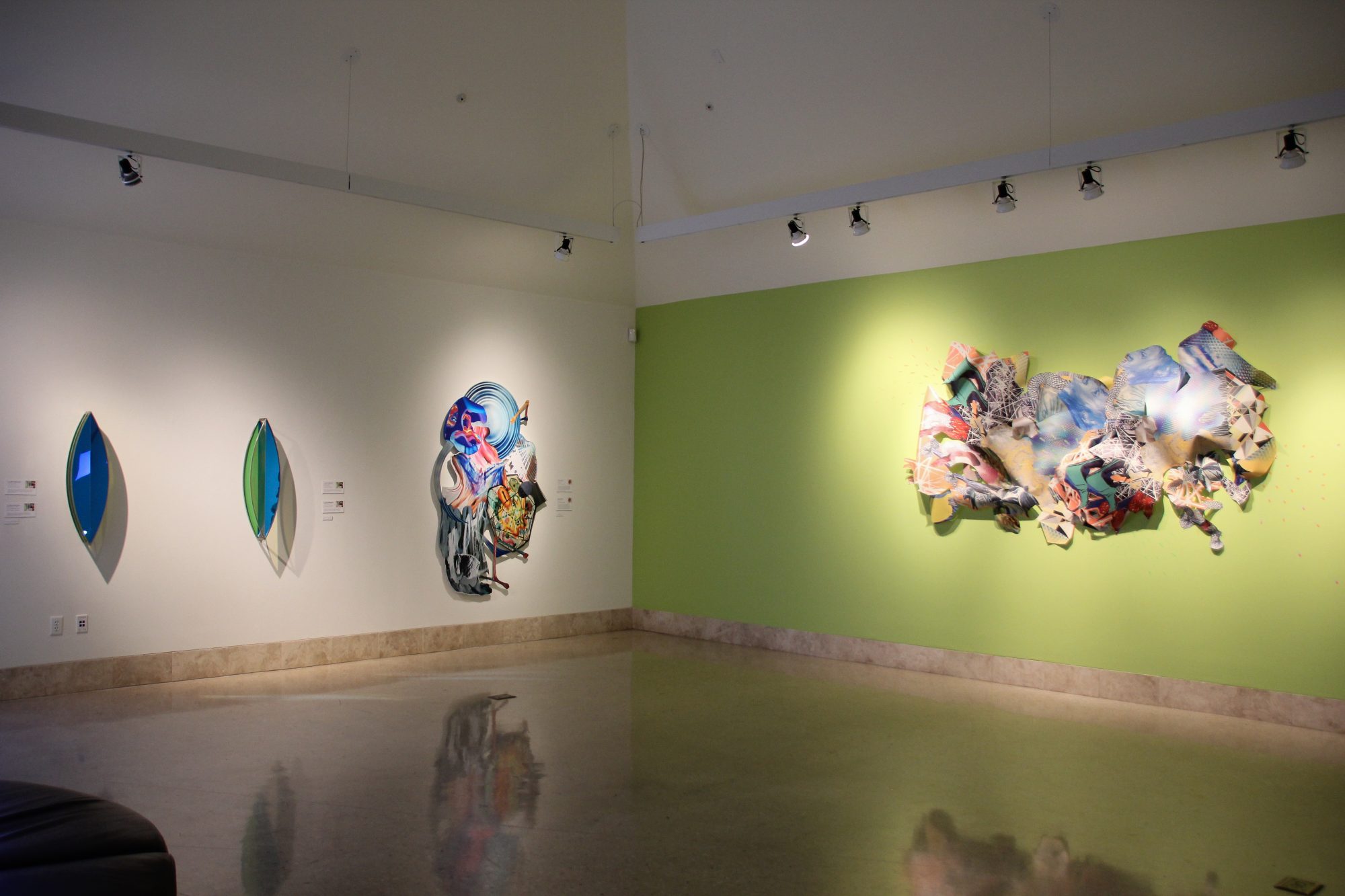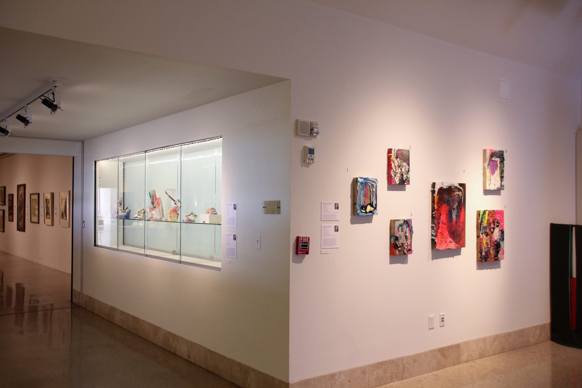 Contemporary sculptor Bethany Johnson (b. 1985) employs a mindful approach whose work is composed of found paper and wood materials which she compresses, taking on the appearance of a geological shift. Abstraction is a vast area that these artists mine in ways that give us many prompts to ponder. Making statements in abstract ways that are personal, such is the works of Dana Frankfort (b.1971), and experiential and conceptual artist Sara Cardona (b. 1971). Being playful as well as thought provoking with the material use and its impact features as a point of departure in the ubiquitous Slinky sculpted benches of Leticia Bajuyo (b. 1976). The soft sculptures by Katy Heinlein (b. 1972) rely on their stance constructed by their relationship to the wall, or floor, or pedestal in suspended color-formed-encounters. The paintings of Leila McConnell (b. 1927) deliver in their messaging a resonance of space in composition and atmosphere which conveys a quality not unlike spiritual meditation. The two large paintings by Susie Rosmarin (b. 1950) often come from an examination of everyday encounters. Her observations are delivered with precision that she devises by masking with tape her stages of paint to reveal a pattern of stunning optic accuracy once the tape is removed.