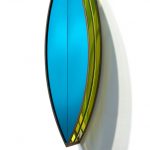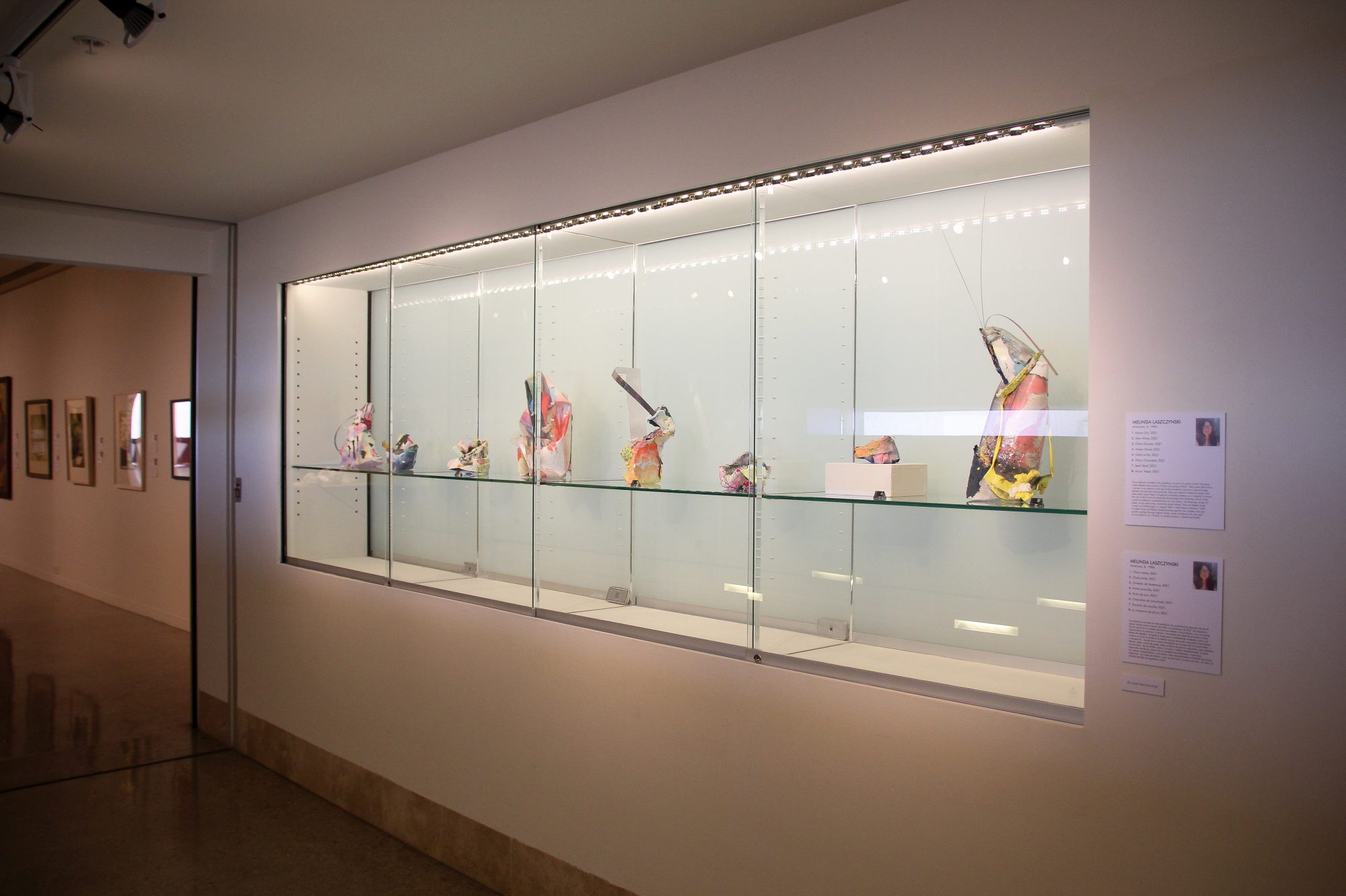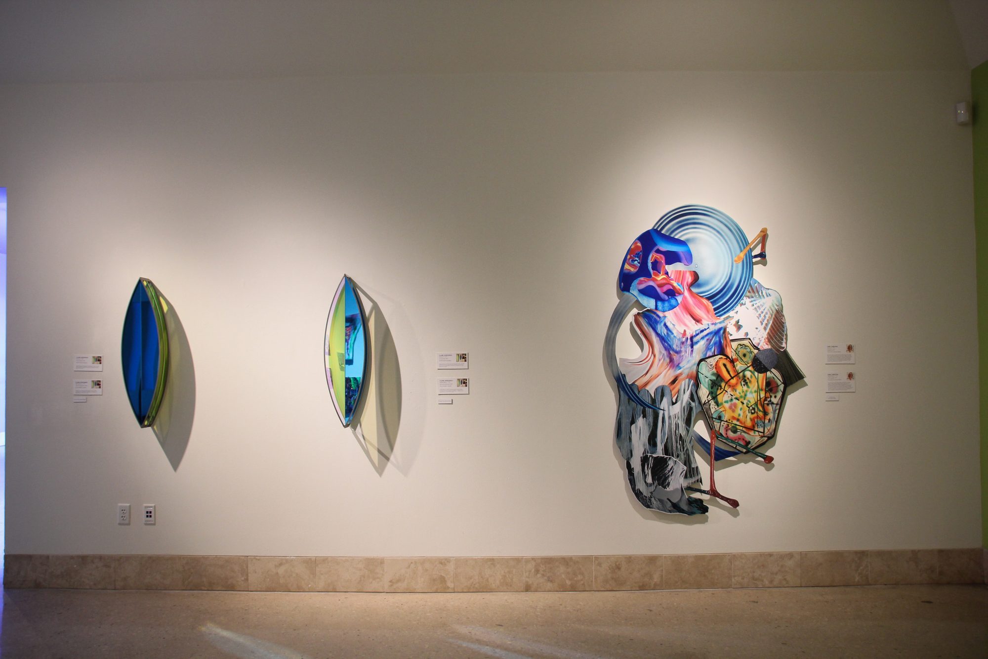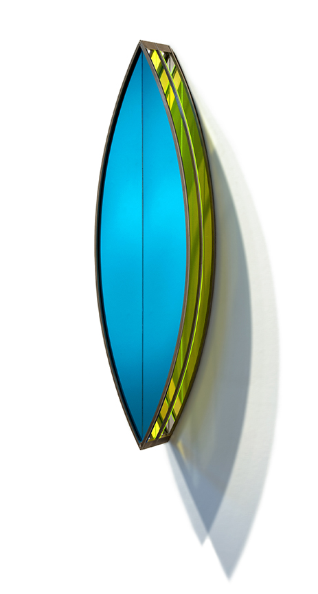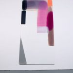 The materiality of some of this work is so attention-grabbing that we can change our viewing position and experience the work in multiple ways, such as with the light and color casting work of Claire Ankenman (b. 1947) and the iridescent, optical illusion of shadow play on paper in full color by Melinda Laszcynski (b. 1986). Laszcynski’s three-dimensional works rely on physics as well as on her own manipulation of the forms to create their direct dynamism. Margo Sawyer’s (b. 1958) Reflecting on Reflect, installation considers light flowing through and onto objects, the spread of its gleaming and radiant footprint in the light filled space is a captivating part of the direct experience in the Keeler Gallery. Unlike other artists who embrace chance, her attention to the interactive dynamics of forms, finishes, and reflective objects are considered and controlled, down to the hover created to make the installation appear afloat.