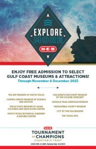 H-E-B and H-E-B Tournament of Champions, in partnership with Visit Corpus Christi and the City of Corpus Christi, announced their ‘Explore More’ program, providing free admission during November and December to nine museums and attractions across the Gulf Coast. In Corpus Christi, this includes The Art Museum of South Texas, the Corpus Christi Museum of Science and History, the Texas State Museum of Asian Cultures and Education Center, and the South Texas Botanical Gardens and Nature Center.